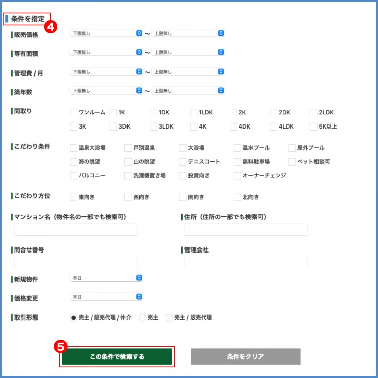 ⑤検索条件が決まったら検索ボタンをクリックしてください -