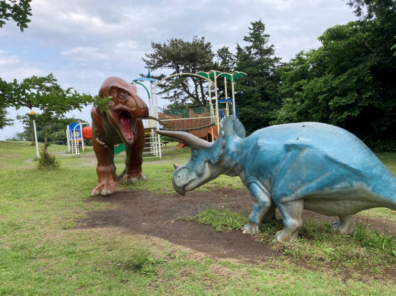 中腹にある恐竜公園はリアルな恐竜のモニュメントや遊具があり、家族でのお出かけにもピッタリです