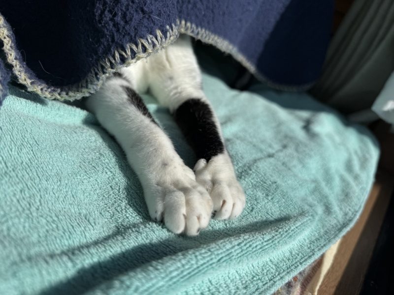 中にすっぽり入っているかと思いきや、なぜか手だけを外に出して日向に当てています。