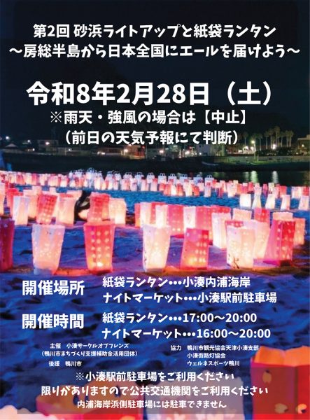 鴨川市の小湊海岸で、今年も紙袋ランタンのライトアップイベントが開催されます。