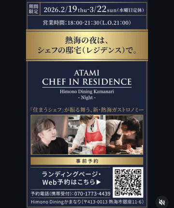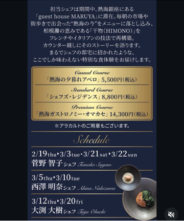 今回はシェフがポップアップでメニューを振る舞う期間で、熱海市内の特産物を扱ったコース料理をいただきました。新しい取り組みの実験の場として、地域の魅力を伝える場として、地域の内外関係なくつながりを生み出す取り組みは素晴らしいと思いました。今回はシェフズ・レジデンスをいただくことに、、!