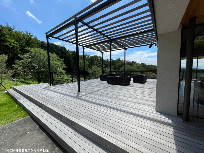 静かな環境の別荘地にあり、隣地とも離れておりさらに閑寂な生活を送れます。角地・屋根付き駐車場完備しておりお庭ではバーベキューも楽しめます。