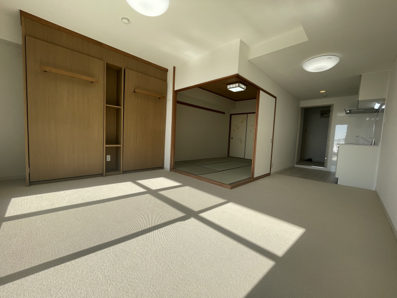 キッチン入替・トイレ入替・エアコン入替・洗面台交換・洗濯パン・水栓交換・クロス全室貼替・天井塗装・和室畳張替・襖貼替・敷き込みカーペット貼替・クリーニング済