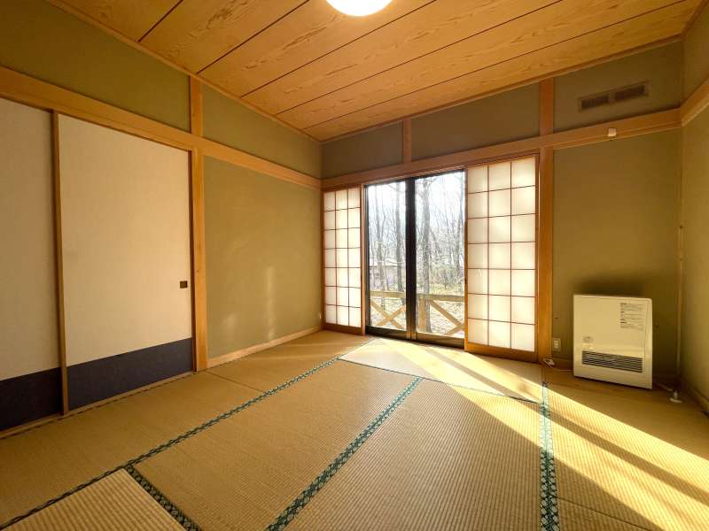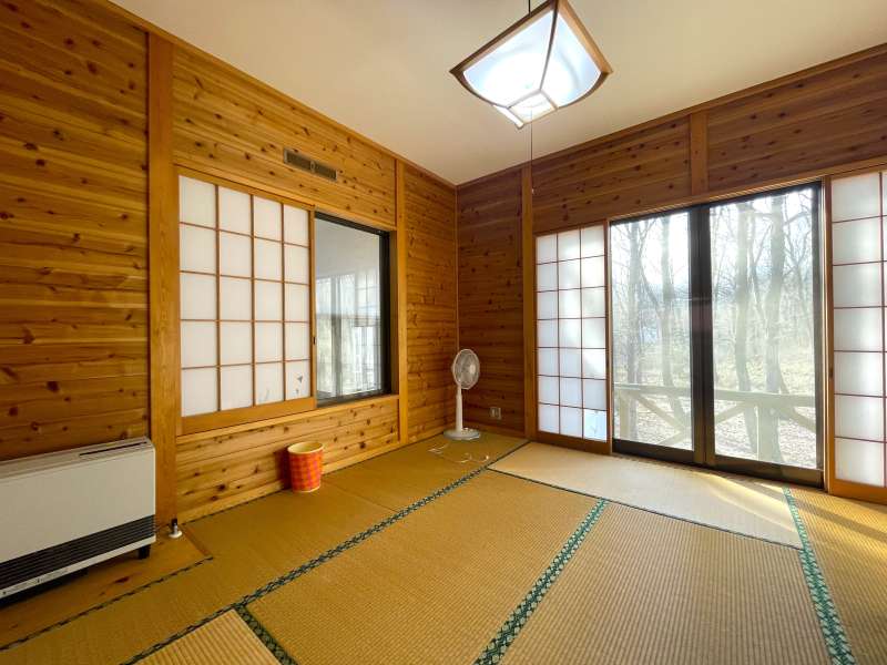板張り浴室+外気浴テラス×ファイヤーピット×温泉可! エンゼルフォレスト那須内の静かな森に佇む、 内外装リフォーム済・人気の平屋建て(92.54㎡)。 約209坪の広大な敷地に、板張りの浴室+外気浴テラス、 さらに大谷石ファイヤーピット付きのウッドデッキを備えた特別な一邸。