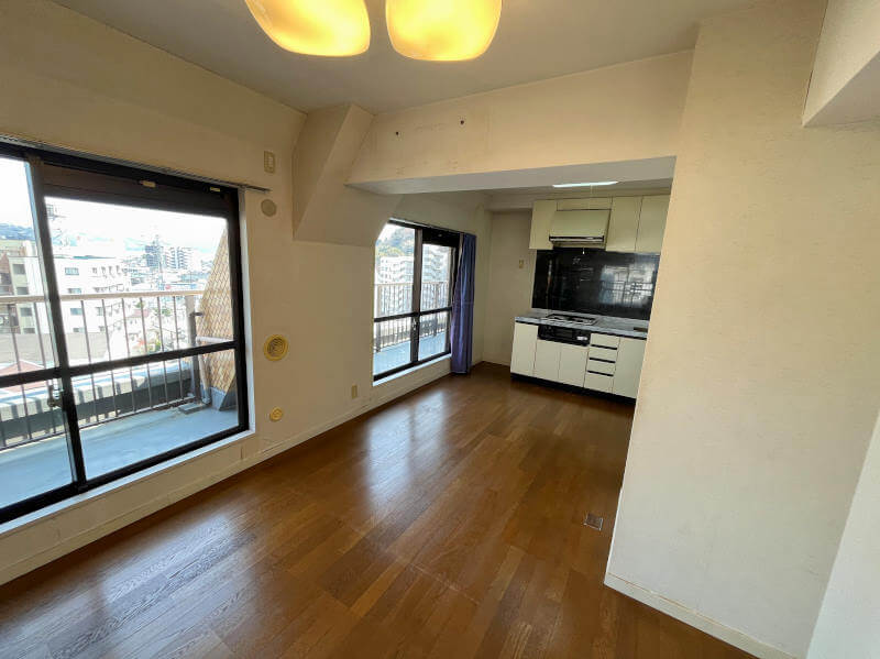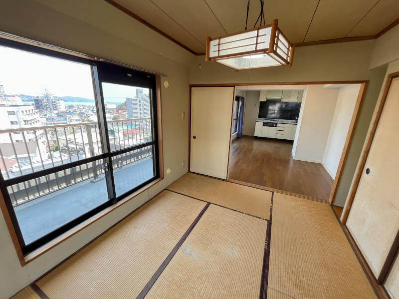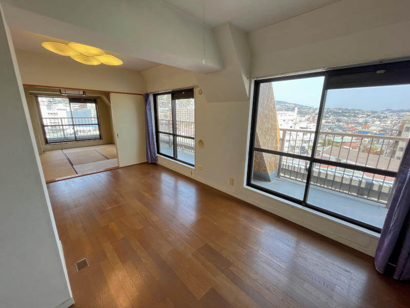 駅から徒歩約7分と生活しやすい立地のマンションです。こちらは7階の角住戸。LDK・洋室・和室に面したルーフバルコニーがあり開放的な室内です。和室をLDKと繋げて広々とした居間がわりにも使うことができますので、団らんの場としていかがでしょうか。