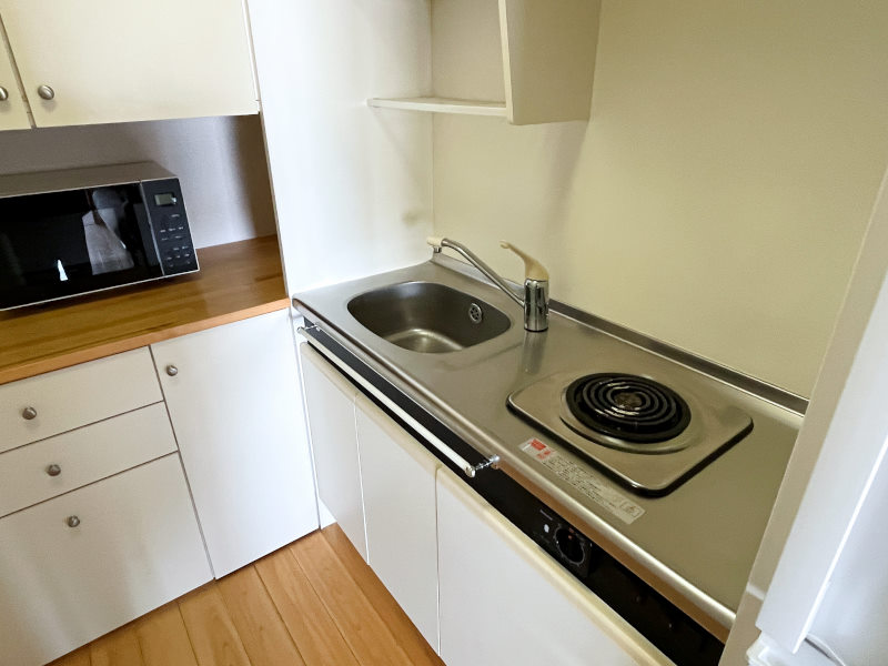給湯/電気温水器、コンロ/電気コンロ、暖房/FF灯油ファンヒーター、冷房/なし(窓枠クーラー設置可能)